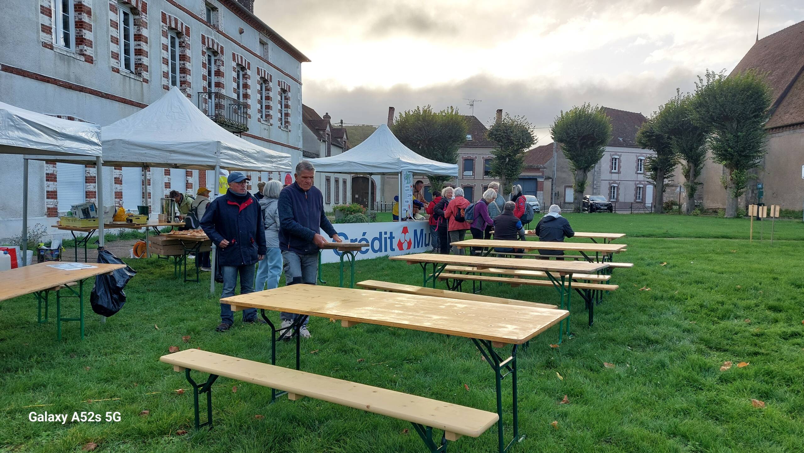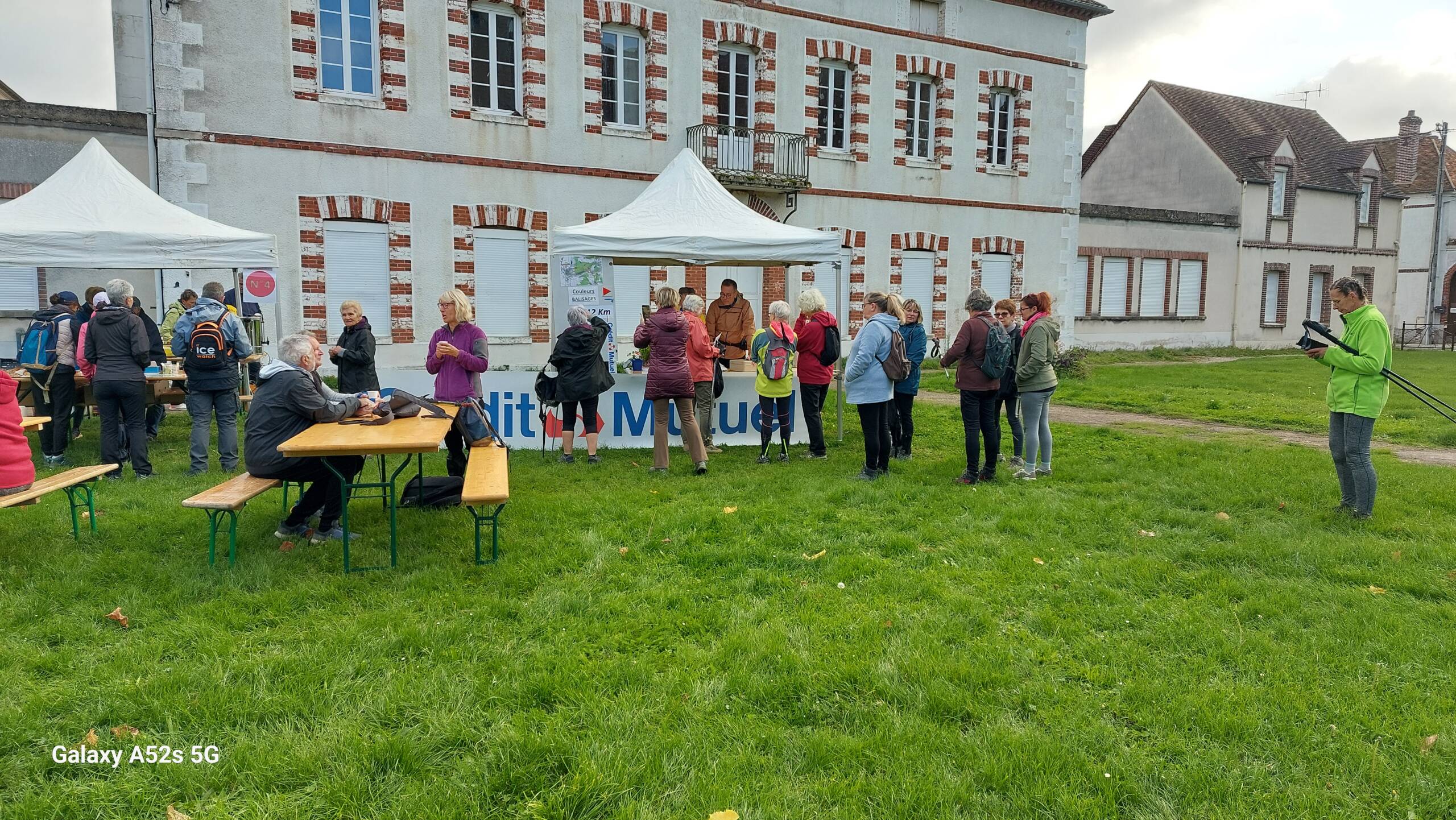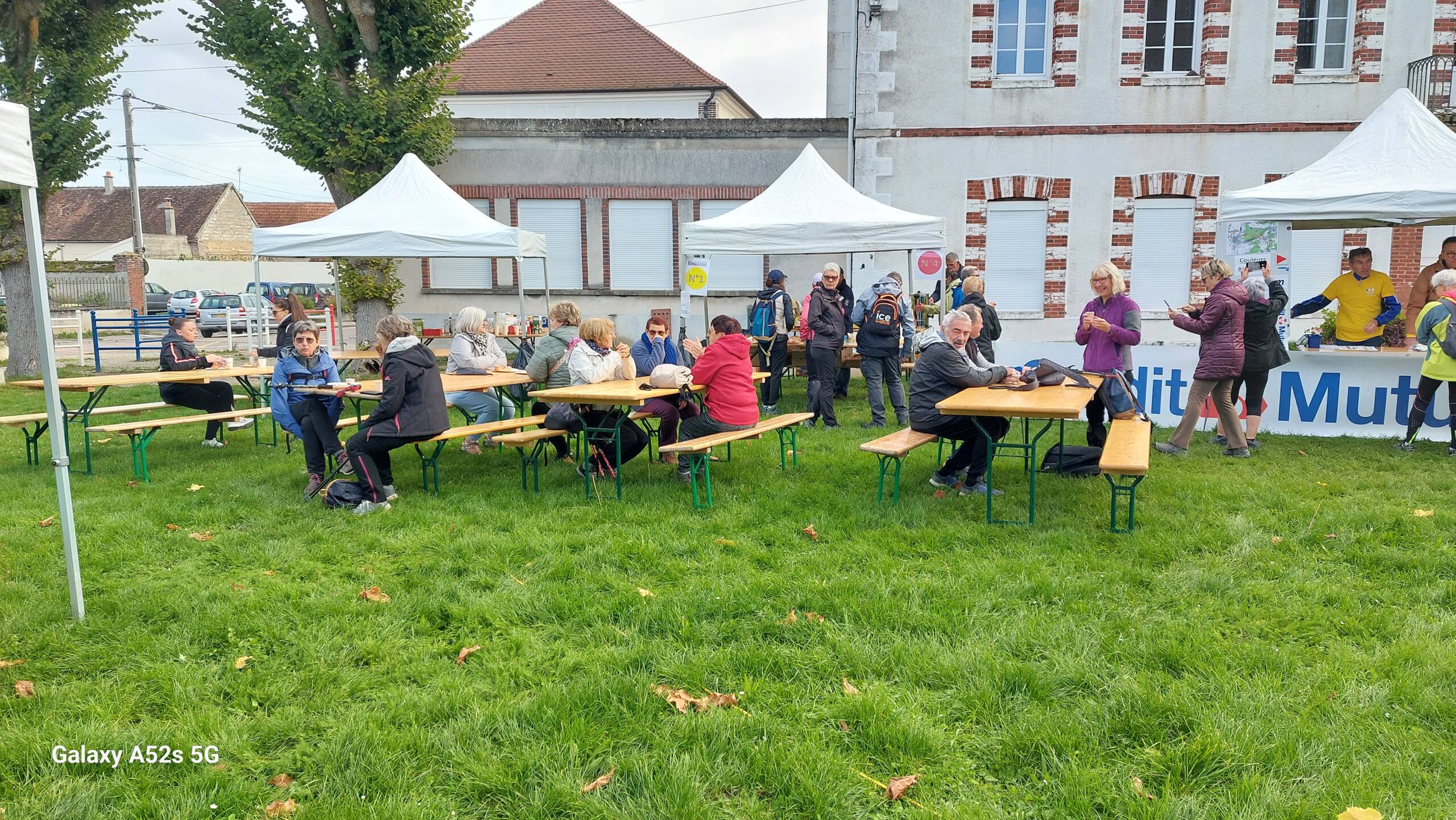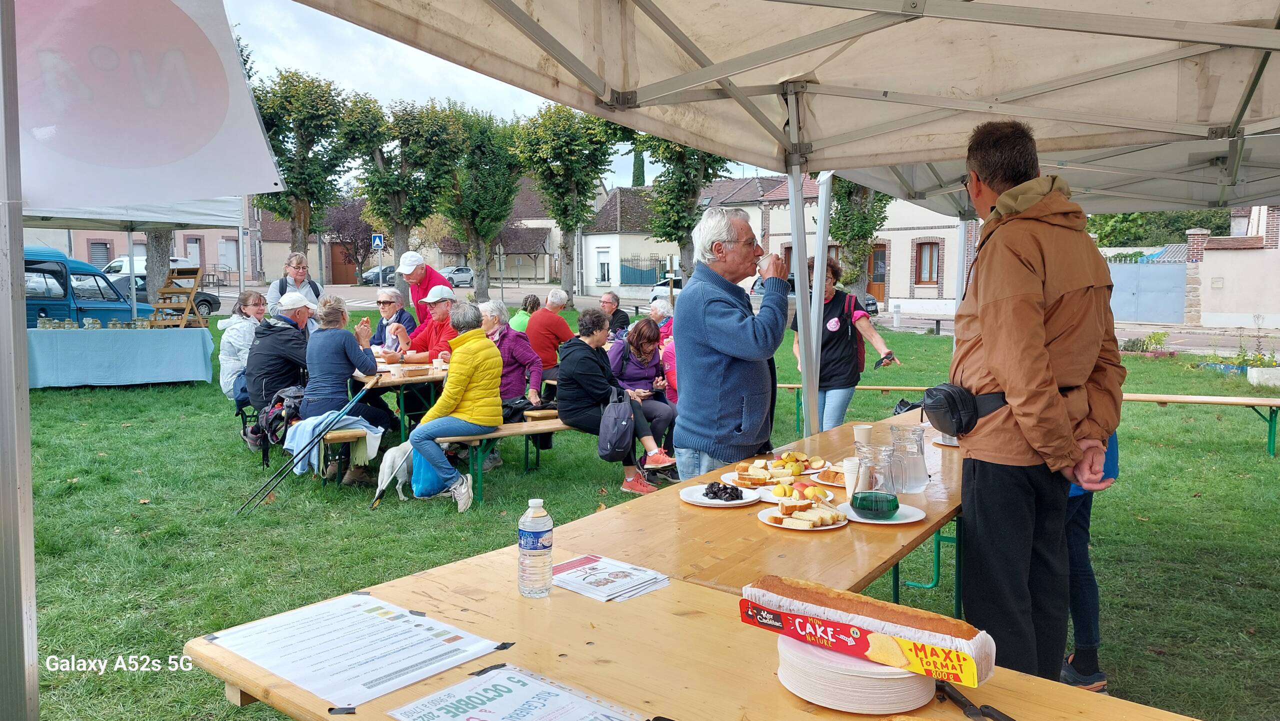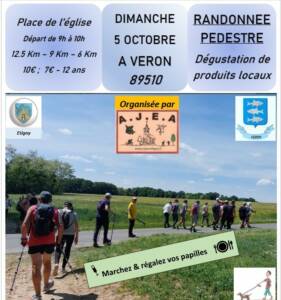 Sur une idée de Maurice, soutenue par Jean-Pierre et Dominique ainsi que les 21 bénévoles de l Ajea présents et la commune de Véron, la première randonnée dégustative a eu lieu dimanche matin 05 octobre. Le rendez-vous a été donné à 7h30 aux organisateurs, place de l’église, pour l’installation des Stands, (Barnums, tables, Bancs, besoins en petits matériels et consommables). Le départ des marcheurs fût donné de 9h à 10 h pour trois parcours au choix ( 6, 9, et 12,5km). Le balisage a été réalisé la veille par nos amis Roland, Jean-Louis, Jean-Pierre, Claude, Dominique et Maurice. Un contrôle de sécurité au niveau du balisage a été effectué par Roland le matin-même vers 7h30.
