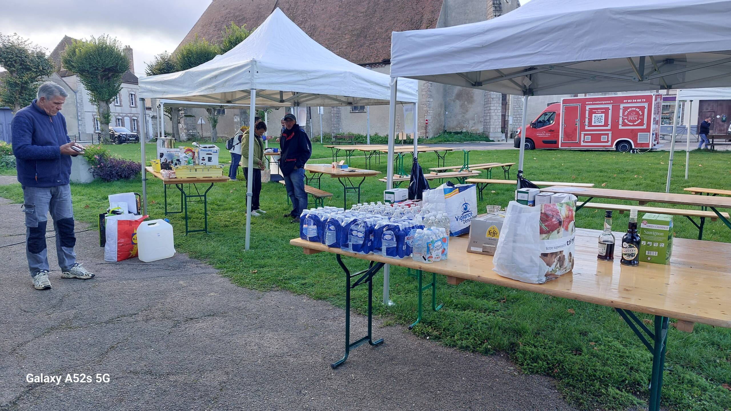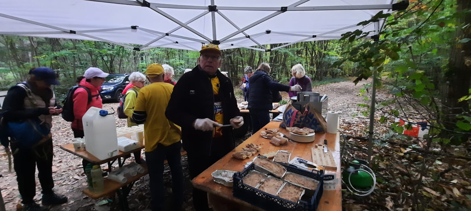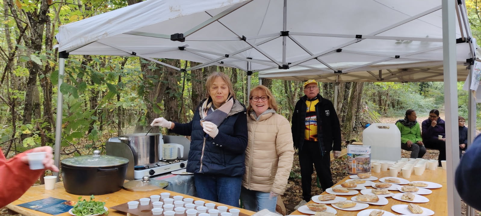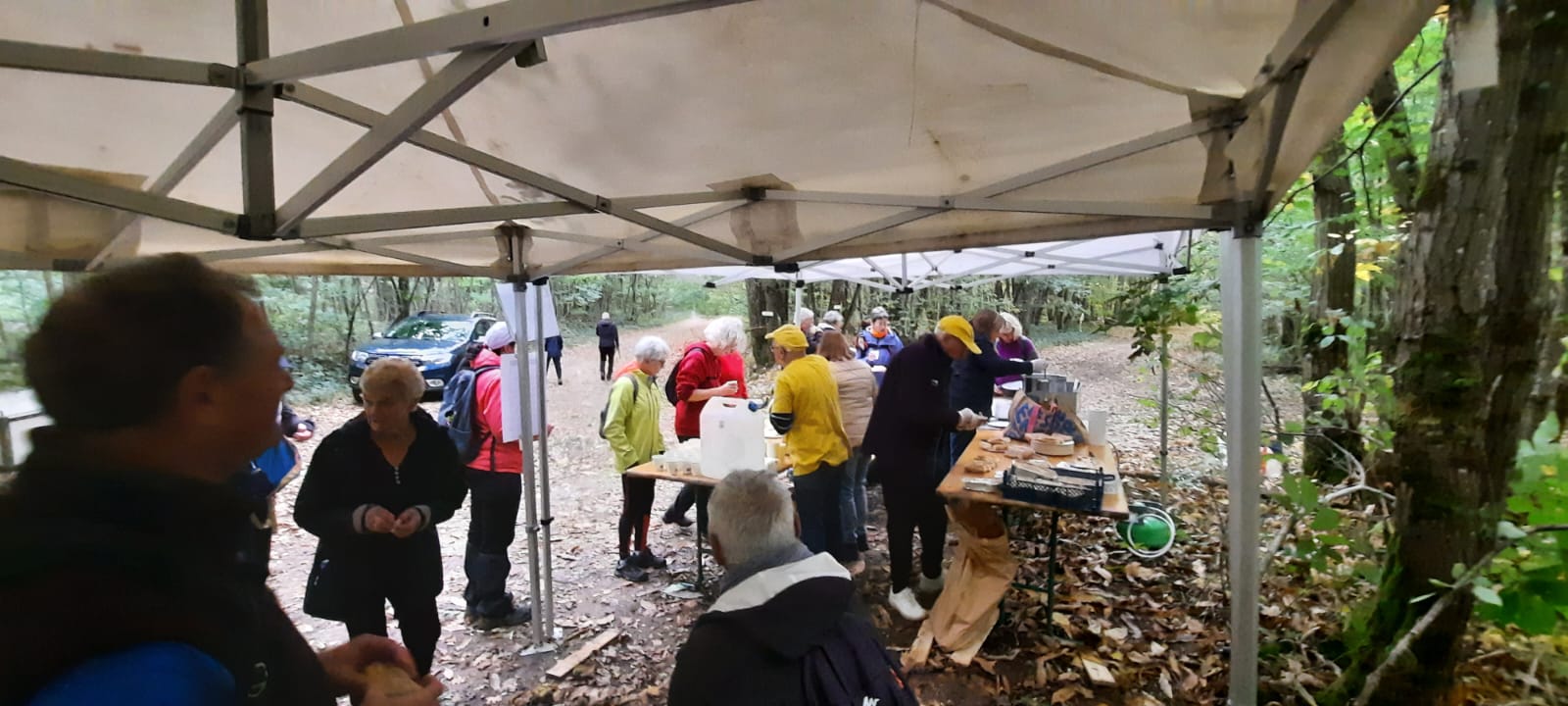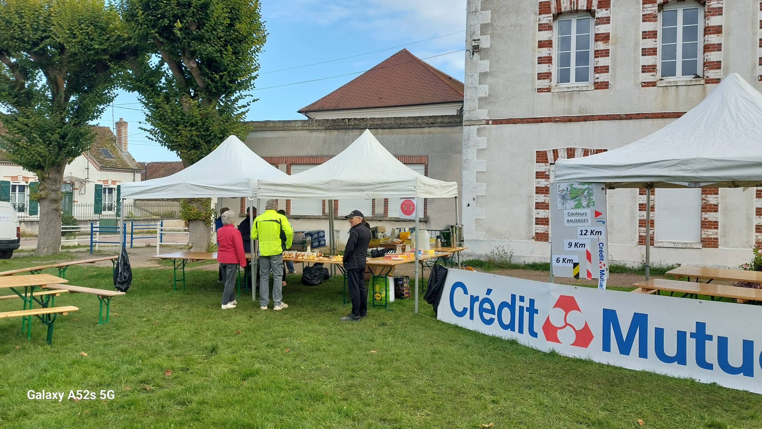 Sur une idée de Maurice, soutenue par Jean-Pierre et Dominique ainsi que les 21 bénévoles de l Ajea présents et la commune de Véron, la première randonnée dégustative a eu lieu dimanche matin 05 octobre. Le rendez-vous a été donné à 7h30 aux organisateurs, place de l’église, pour l’installation des Stands, (Barnums, tables, Bancs, besoins en petits matériels et consommables). Le départ des marcheurs fût donné de 9h à 10 h pour trois parcours au choix ( 6, 9, et 12,5km). Le balisage a été réalisé la veille par nos amis Roland, Jean-Louis, Jean-Pierre, Claude, Dominique et Maurice. Un contrôle de sécurité au niveau du balisage a été effectué par Roland le matin-même vers 7h30.