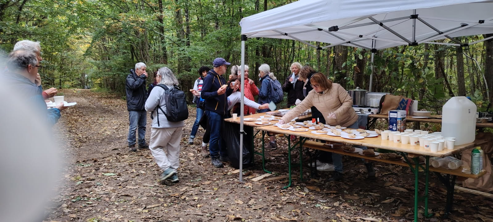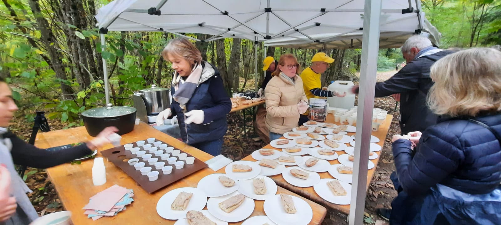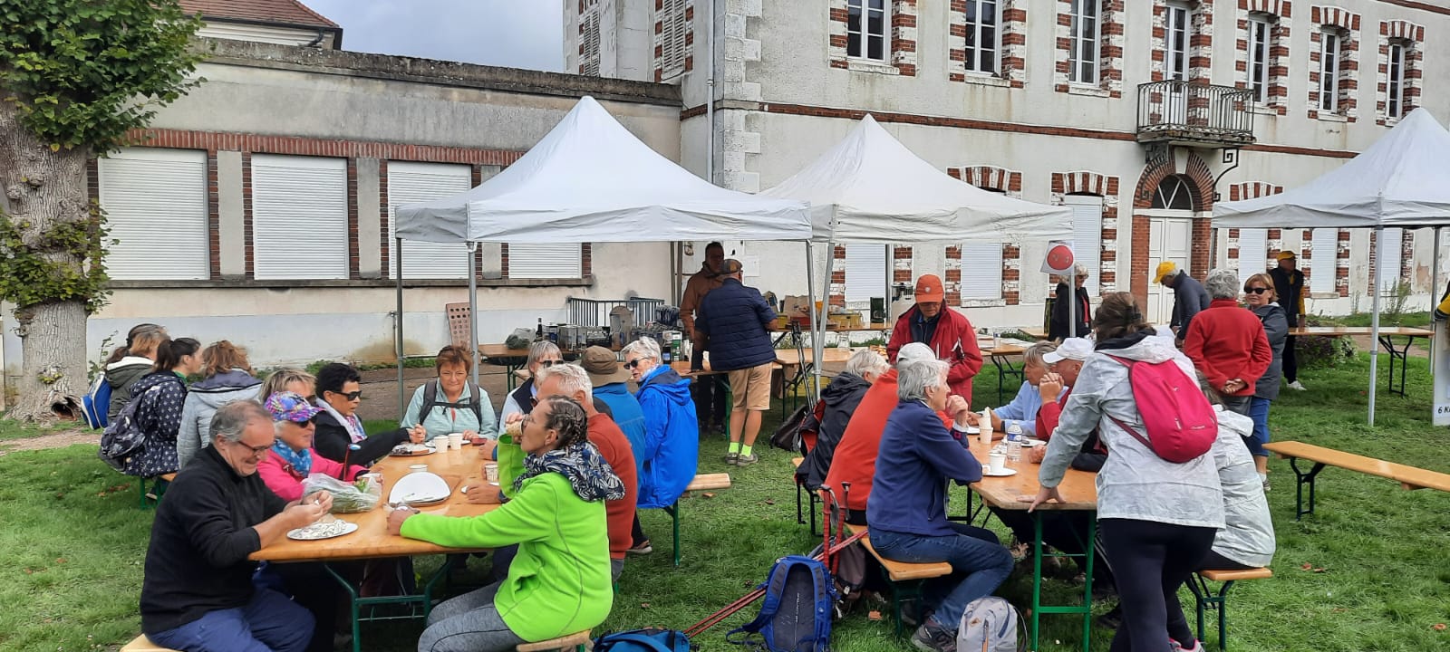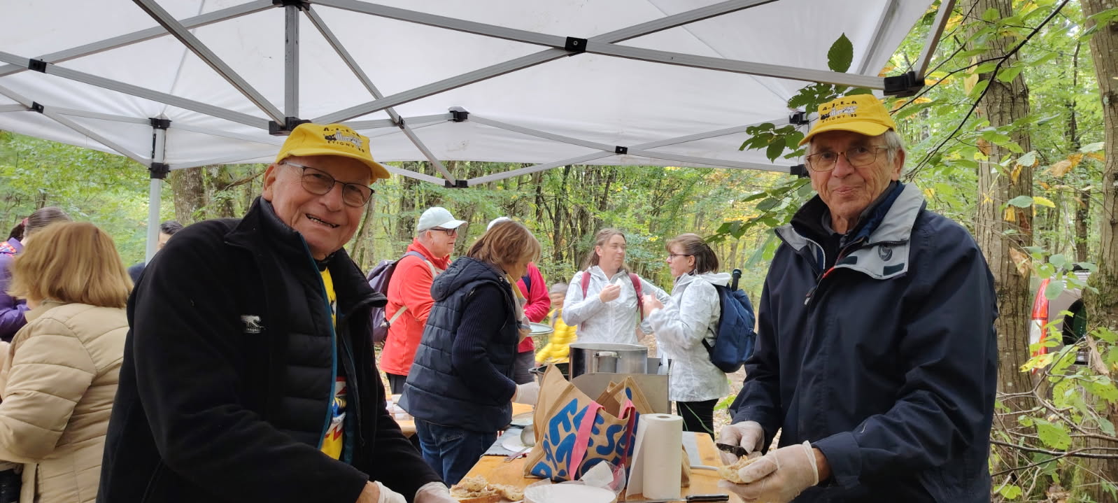 Sur une idée de Maurice, soutenue par Jean-Pierre et Dominique ainsi que les 21 bénévoles de l Ajea présents et la commune de Véron, la première randonnée dégustative a eu lieu dimanche matin 05 octobre. Le rendez-vous a été donné à 7h30 aux organisateurs, place de l’église, pour l’installation des Stands, (Barnums, tables, Bancs, besoins en petits matériels et consommables). Le départ des marcheurs fût donné de 9h à 10 h pour trois parcours au choix ( 6, 9, et 12,5km). Le balisage a été réalisé la veille par nos amis Roland, Jean-Louis, Jean-Pierre, Claude, Dominique et Maurice. Un contrôle de sécurité au niveau du balisage a été effectué par Roland le matin-même vers 7h30.