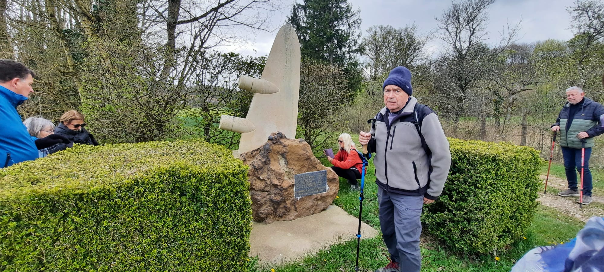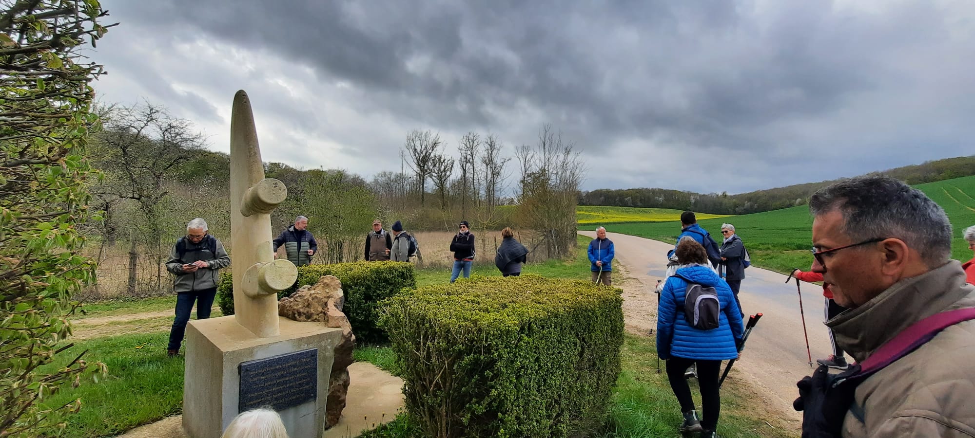 17 marcheurs et marcheuses sont partis du parking du cimetière de Villebougis pour une rando de 11 kms. Après avoir longé la forêt nous passons au lieu-dit “Les Sablons” puis traversée des sous-bois et cultures, visite d’un habitat troglodytique dans la craie à proximité du lieu-dit “Les Barons ” . Ensuite nous arrivons devant le monument érigé en souvenirs aux victimes du Starling Lj 827 de la Royal Air Force abattu le 25 août 1944. Touché par erreur par les Américains le bombardier s’est écrasé, 5 occupants sont morts, 1 seul est rescapé. Puis traversant une belle forêt, certains sont partis sur le 8 kms. Christian aurait bien voulu les suivre mais il a vu sa monture qui lui paraissait trop petite partir. Après 3 kms de passage dans les bois, arrivée au pied de la A19 et longeant les bois, retour au parking. Belle rando très agréable.