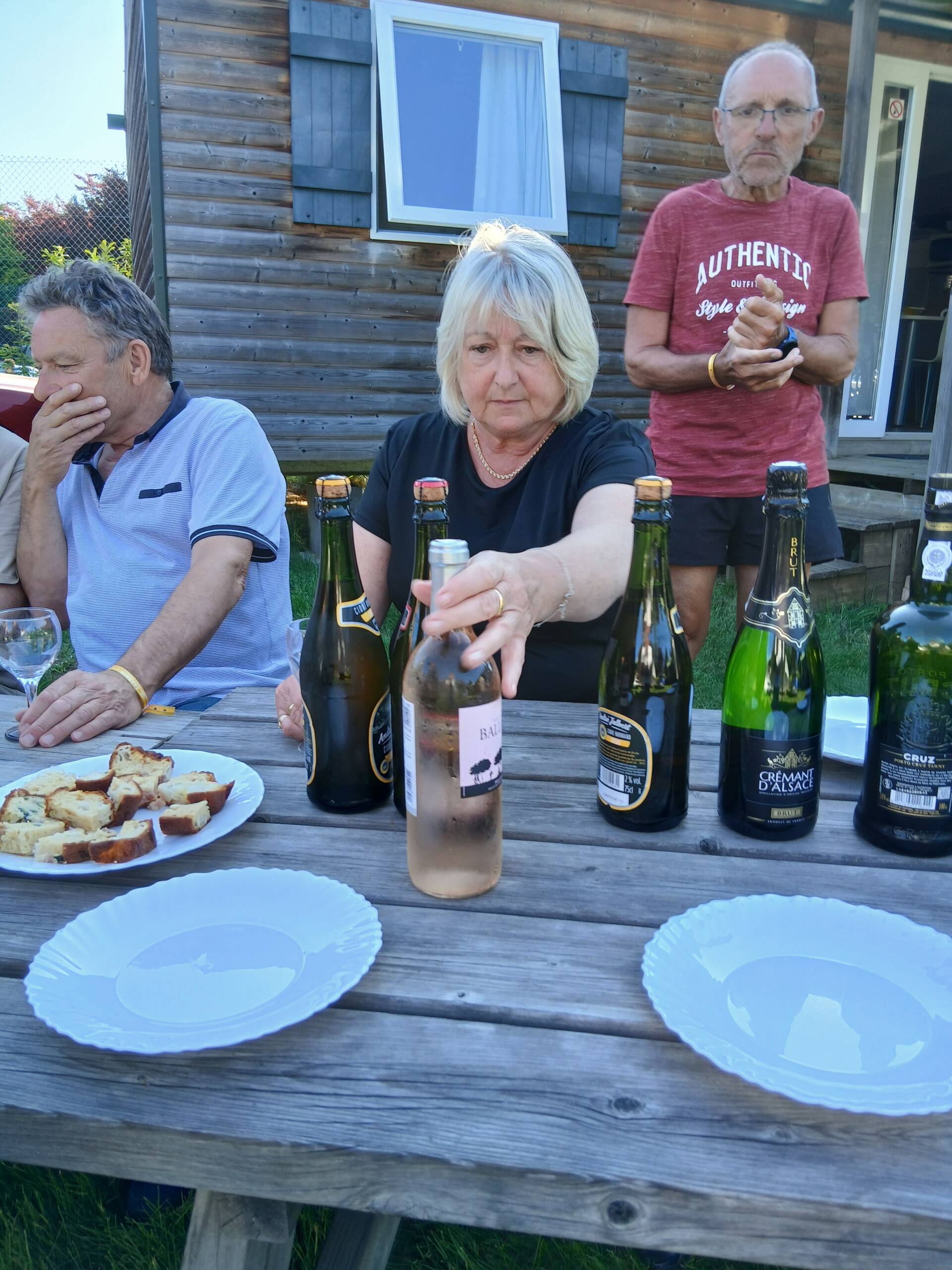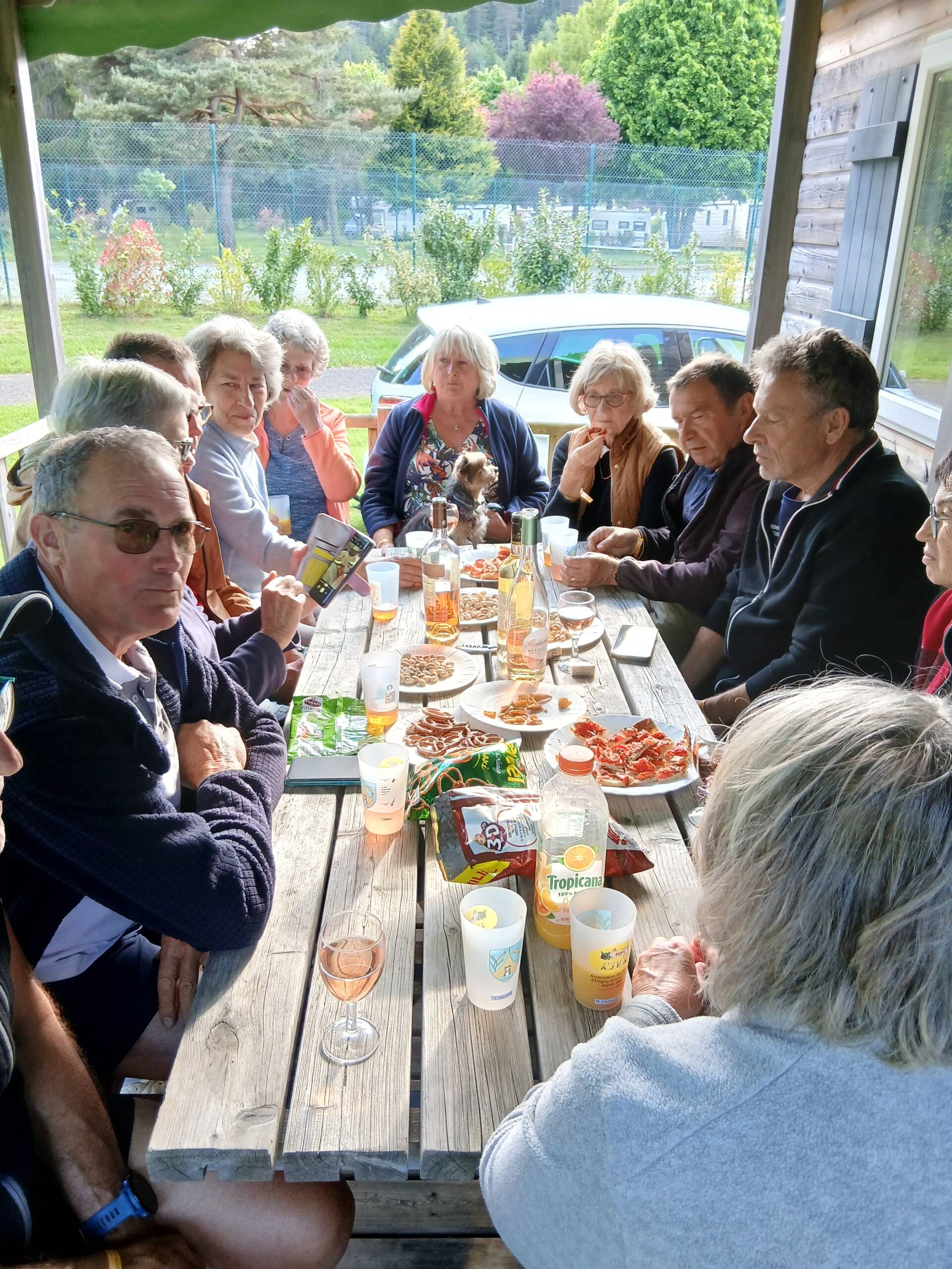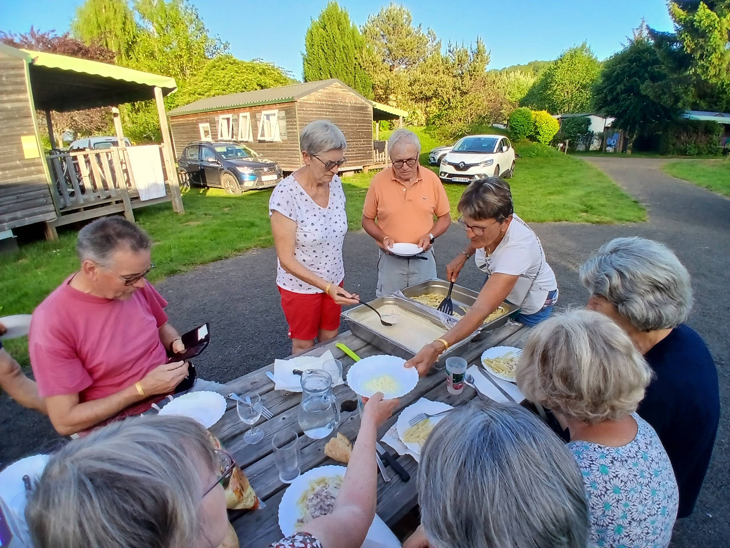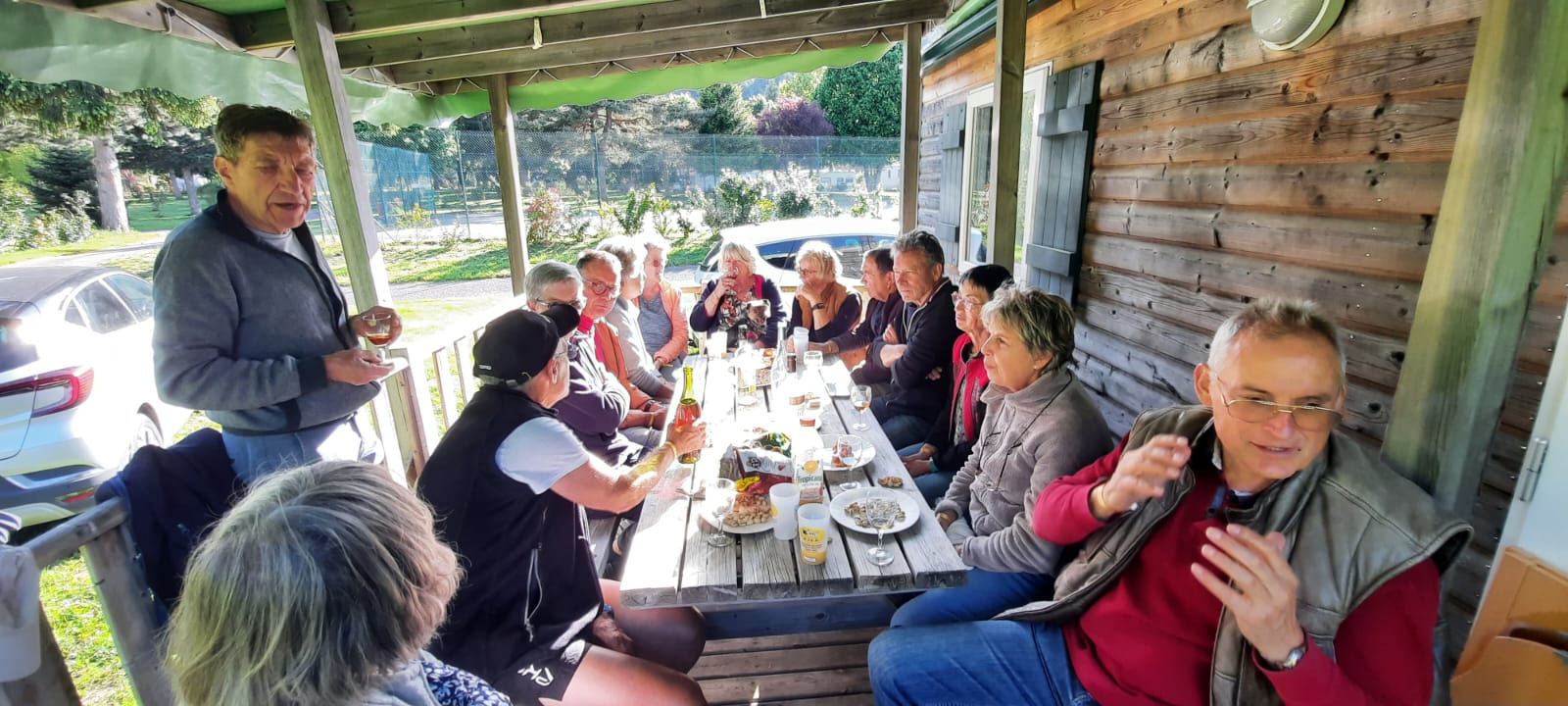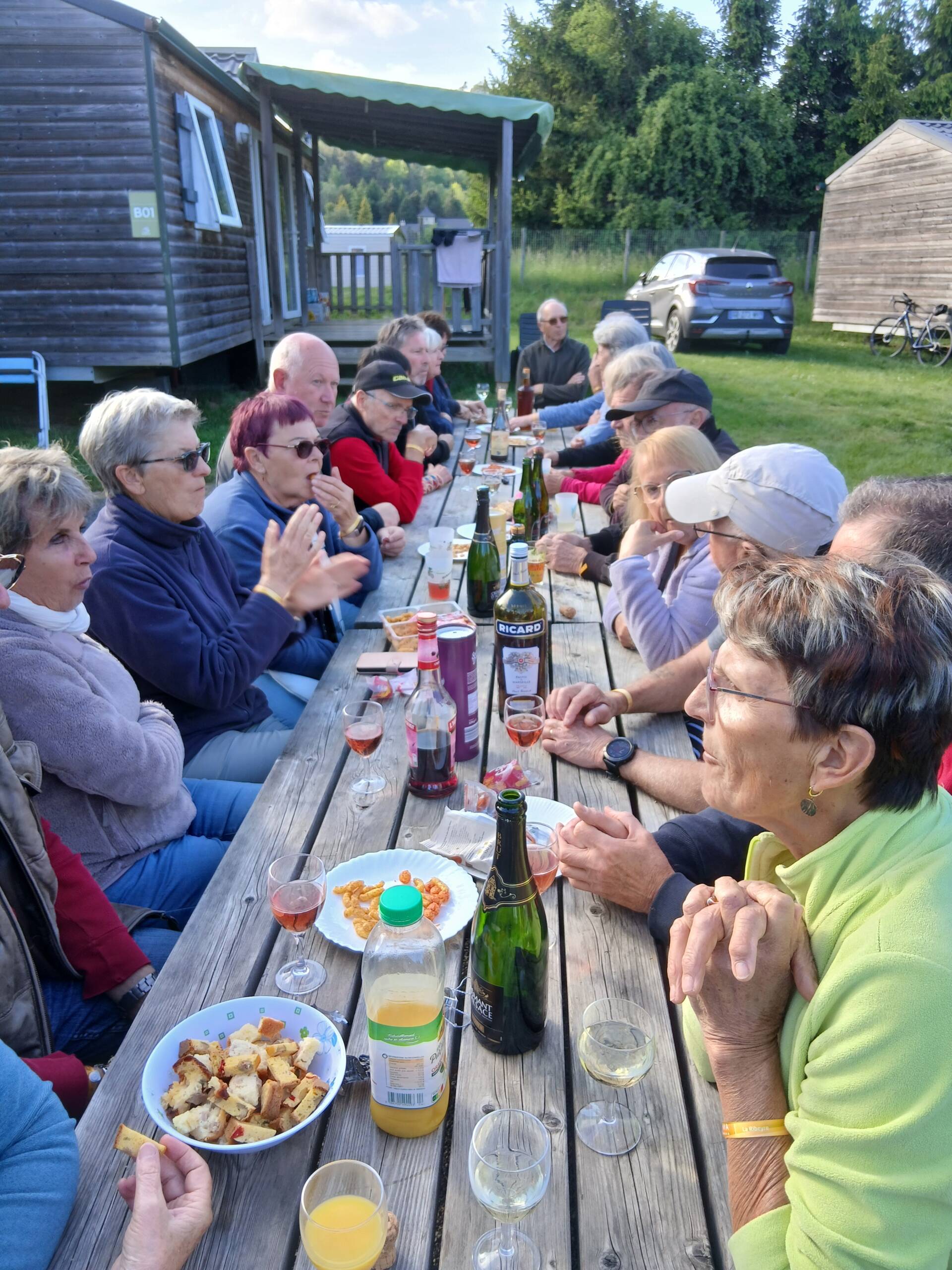 - Une fois chacun installé, apéritif sur la terrasse d’un des mobile home. Il s’est vite avéré que l’espace serait rapidement insuffisant pour l’ensemble. Il fut donc décidé d’installer 3 tables en extérieur au centre des hébergements style banquets « Gaulois ». Et c’est là que nous avons chaque jour pris l’apéritif et quelques repas.