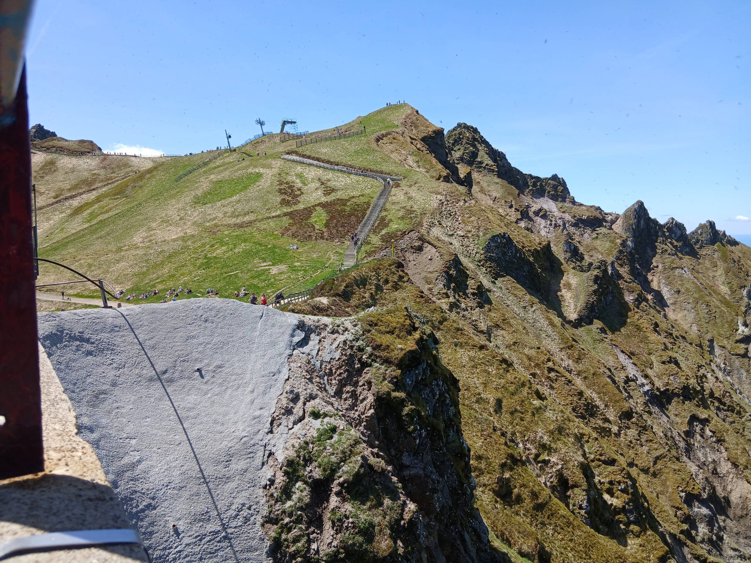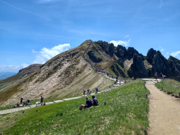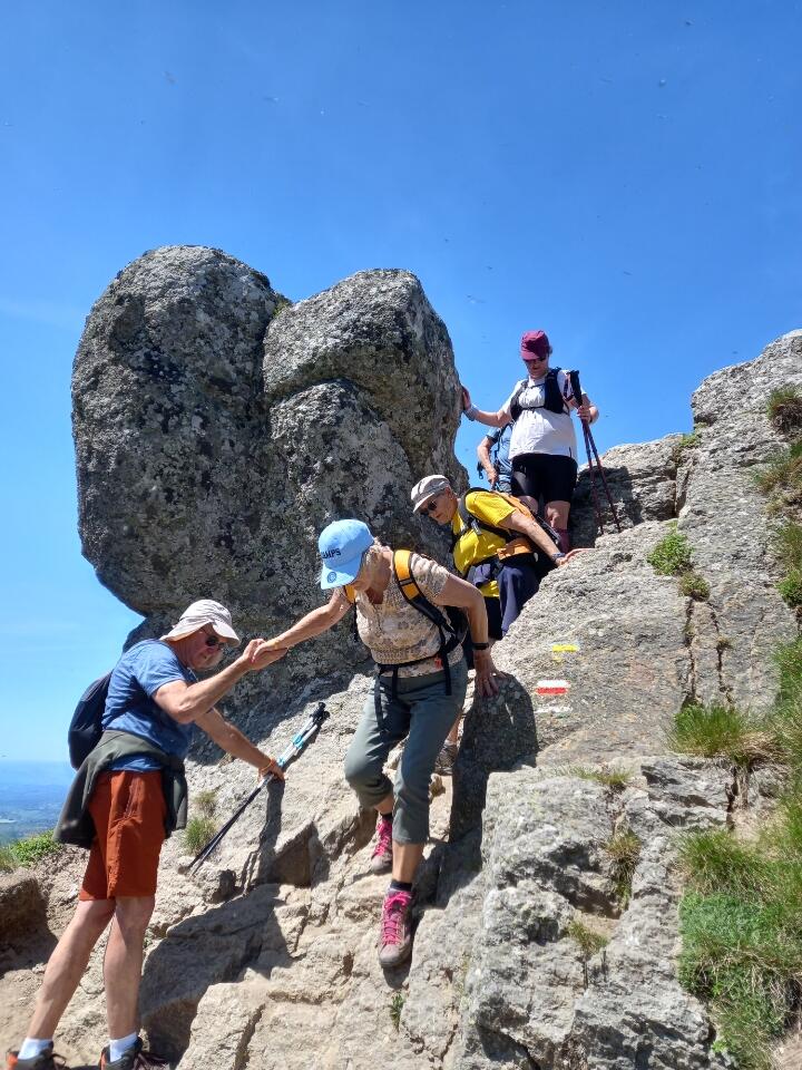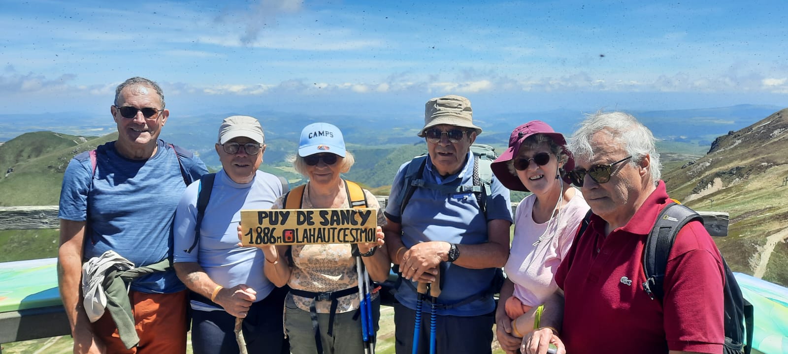 - Journée en commun cyclo et rando Rendez-vous au Mont Dore pour achat des casses croutes du midi. Un groupe emprunte le funiculaire, puis marche en forêt durant 3,7 Km pour rejoindre le départ du Téléphérique qui les emportera au puy de Sancy. Le second groupe part à pied de la gare du téléphérique et rejoint le premier groupe pour le pique-nique. Les plus courageux ont gravi la dernière pente pour atteindre le point culminant de l’auvergne à 1 886 m. Retour au Funiculaire, 3,7 Km pour le premier groupe Descente à pieds pour les autres. le Puy de Sancy (1885 m) par le Val de Courre, boucle de 7 km seulement mais presque 600 m de dénivelé d’un coup ! 4 tronçons distincts : chemin montant au fond d’un vallon, puis sentier rocheux en lacets serrés, ensuite la montée se poursuit sur une crête avec passages avec câble de main courante et enfin une volée de plusieurs centaines de marches ! Au sommet, vue à 360 ° – Diner au restaurant du camping : Terrine – lasagnes – Dessert